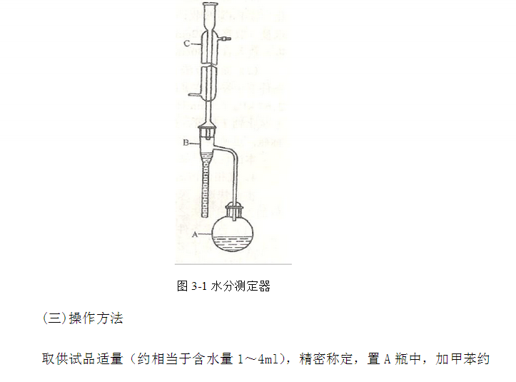 分析天平(感量0.001g)、電熱套、甲苯、亞甲藍(lán)等 水分測(cè)定器裝置如圖3-1。A為500ml的短頸圓底燒瓶;B為水分測(cè)定管;C為直形冷凝管,外管長(zhǎng)40cm。