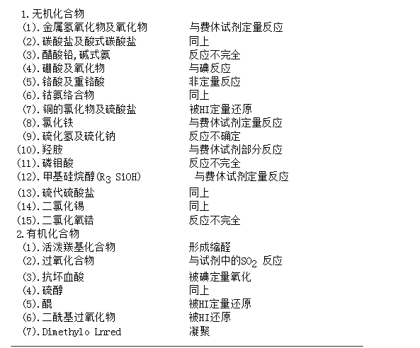14.氯化鐵和試劑中包含的活性氯,如二氯異氰酸鹽可以被卡爾費休試劑中  的HI所還原,這種干擾可用吡啶和二氧化硫及甲醇溶液預處理試樣加于消除。在四氯化碳中包含大約1%的游離氯異氰酸鉀鹽,當含量在0.001%到0.1%范圍內,可通過已用過的甲醇及吡啶,二氧化硫溶液處理后進行測定。
