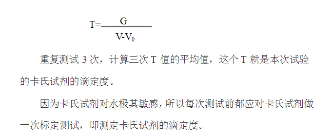 精密稱取約20-25mg的純水(重量以G、mg表示)加入反應瓶中,蓋好瓶口,記錄滴定管中卡氏試劑的起始讀數(shù)(V0、ml),然后開始滴定。如同2.6中一樣直到反應終點,記錄滴定管讀數(shù)(V、ml),按下式計算本次試驗的卡氏試劑滴定度(T):