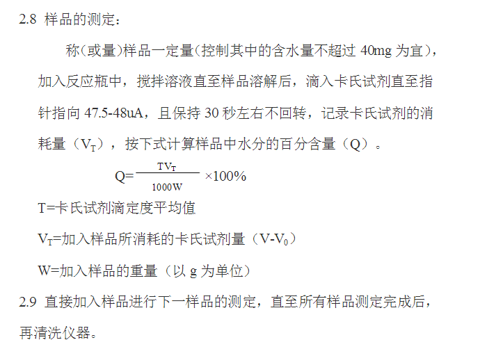 2.6 接著把測定開關(guān)向右轉(zhuǎn)到調(diào)到“測定”擋,指針自動歸零。然后向反應瓶中滴加卡氏試劑。加的速度視瓶中的水分(即甲醇中的水分)的多少而定。一般開始可以快一些,當接近終點時宜稍慢一點,且不及時返回,就表示已近終點。當指針指向47.5-48uA(兩小格以內(nèi)),此時溶液為紅棕色,且保持30秒左右不回轉(zhuǎn)就表示終點已到,表示甲醇的水分已被消除。 2.7卡氏試劑的標定