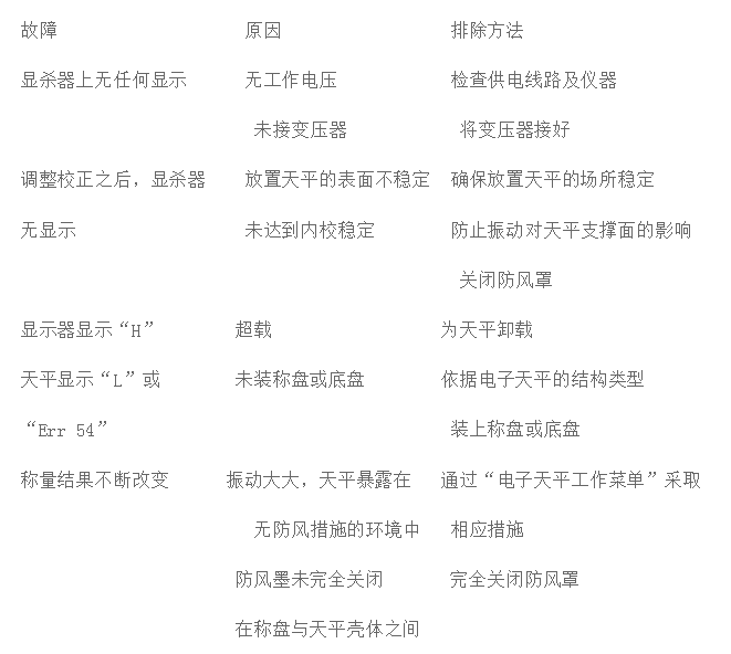 解決方法:1)只在量程范圍內稱量;2)用芷確的砧碼重新進行校準。 4.故障現象:開機顯示“L”,加載顯示“H”或開機顯“H”,加載顯示“L"    原因:天平超出允許工作的溫度環境。