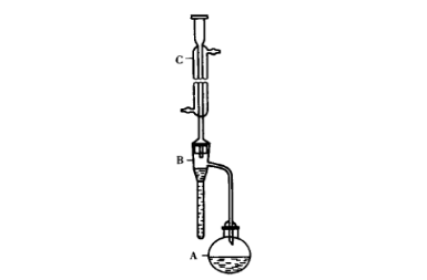 儀 器 裝 置 如 圖 。 A為5 0 0 m l的 短 頸 圓 底 燒 瓶 ; B為 水分測定管;C為直形冷凝管,外管長40cm。使用前,全部儀器應清潔,并置烘箱中烘干。